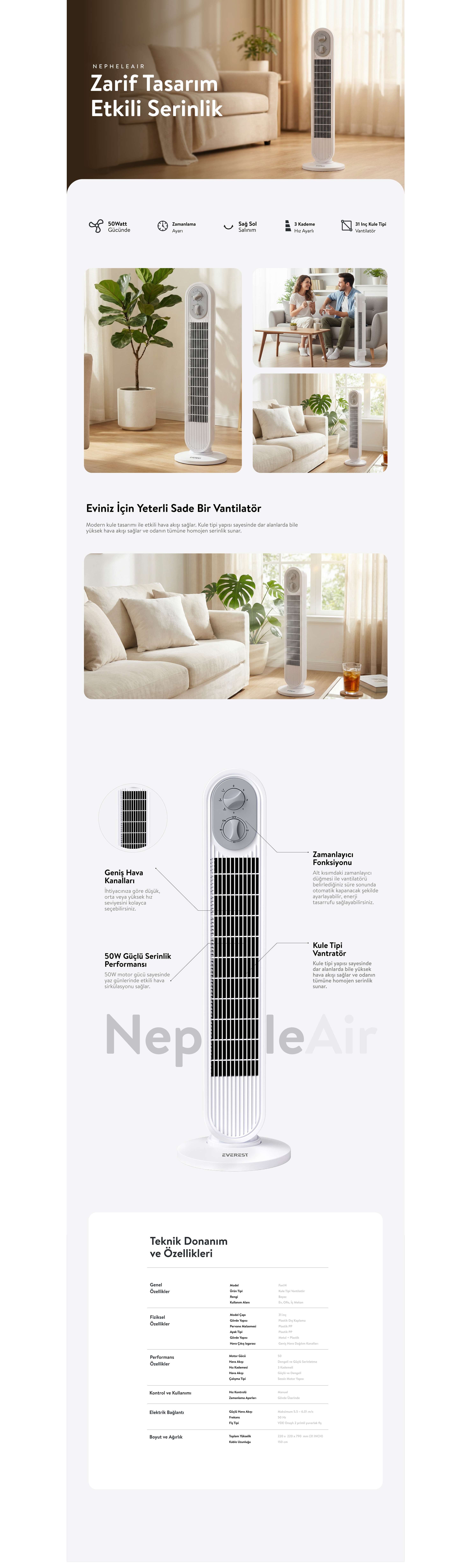 Everest FAN14 Beyaz 31 50W 3 Hız Kademeli Zamanlayıcı Kule Tipi Vantilatör/ Pervanesi