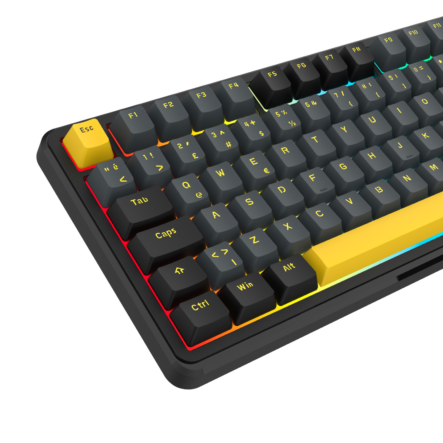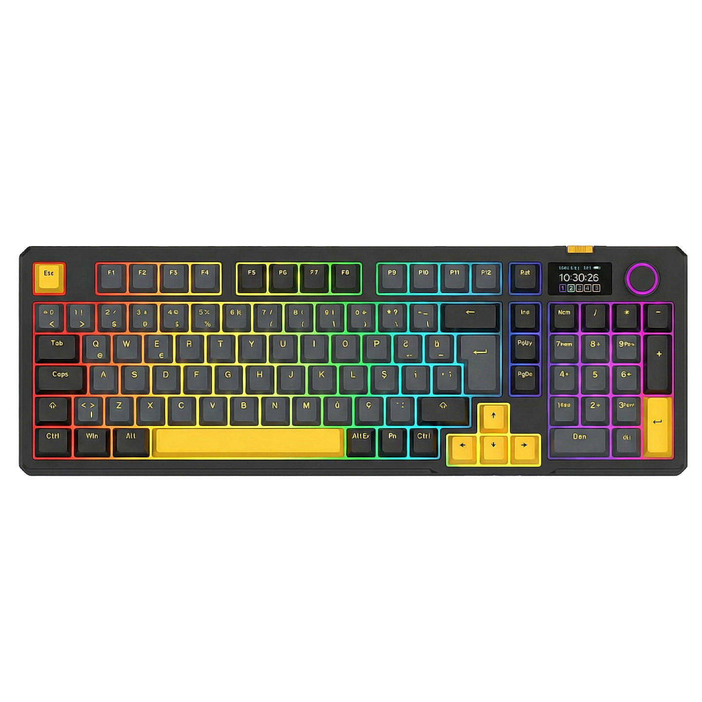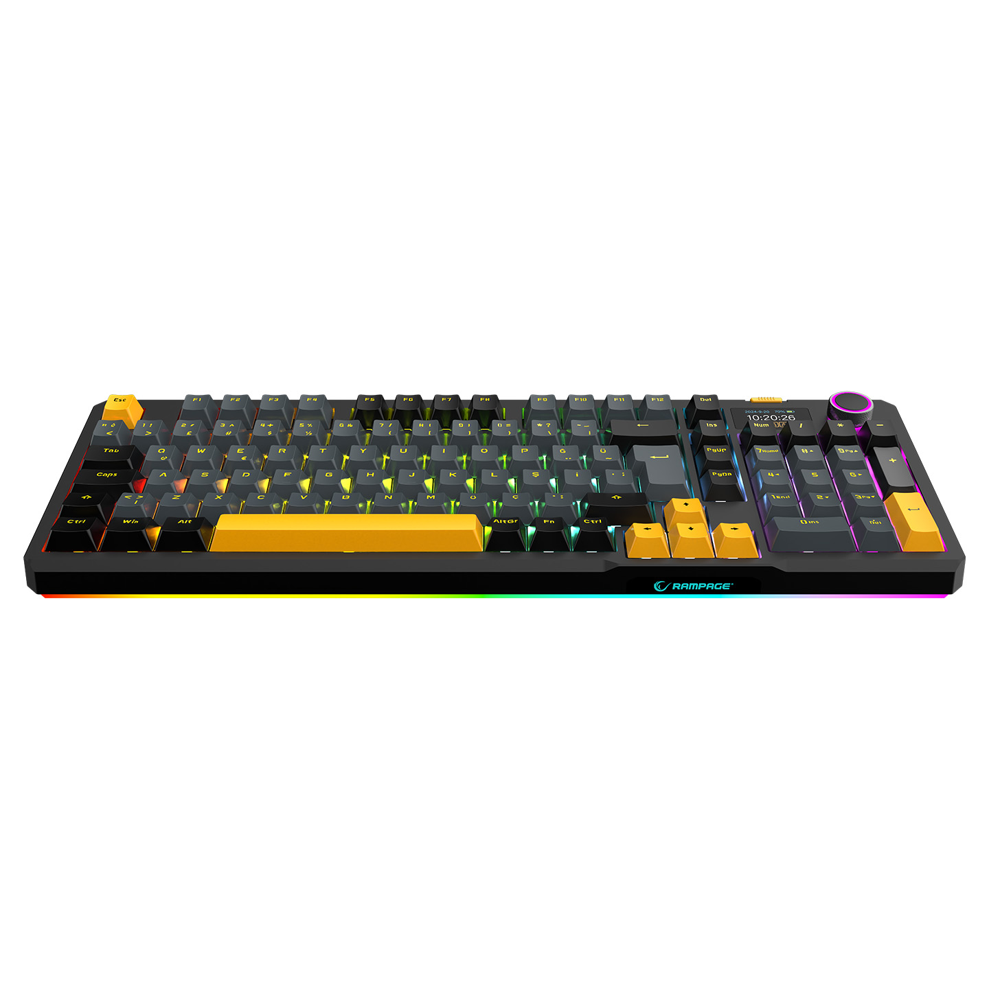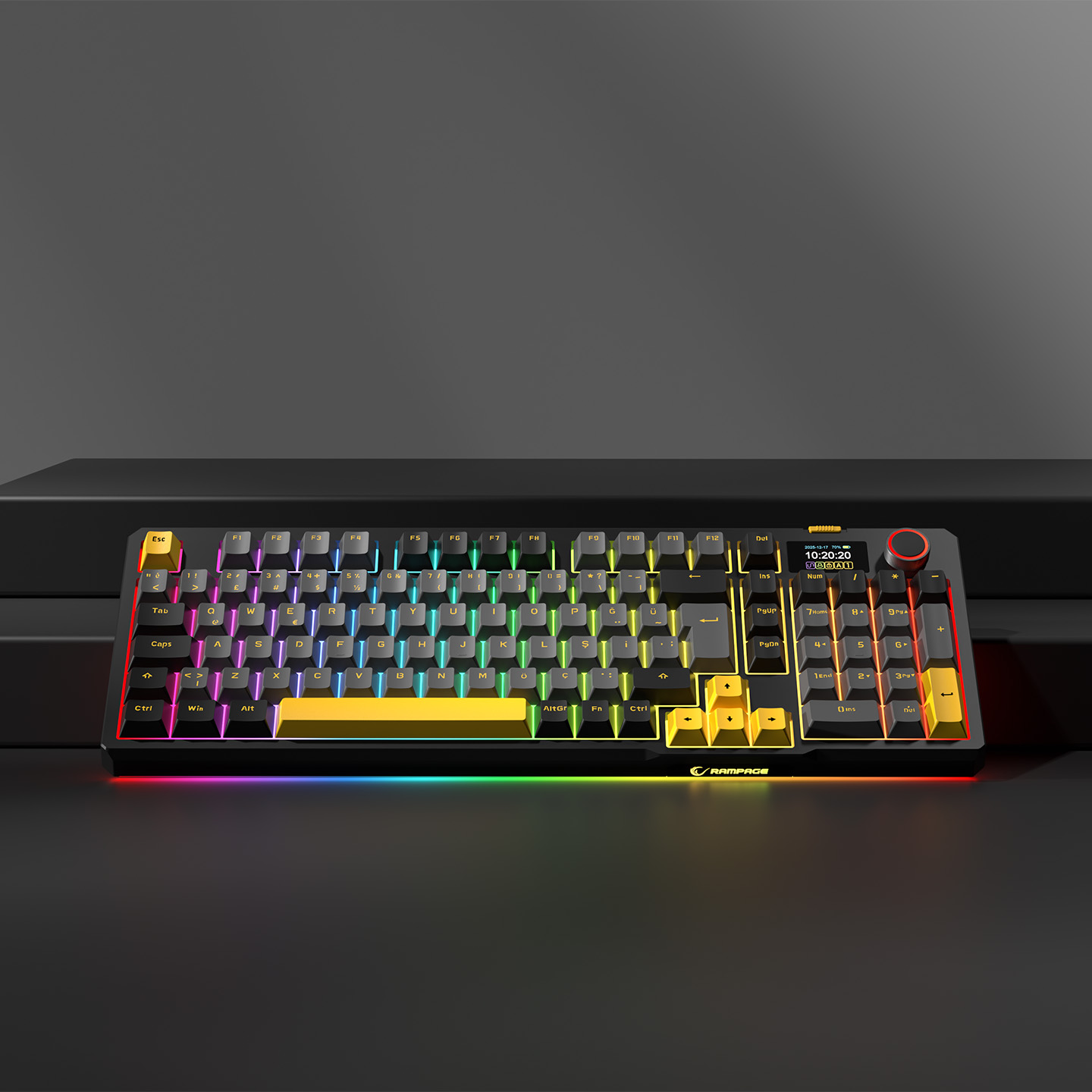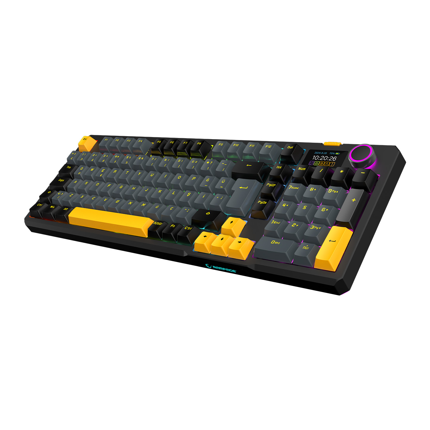 Rampage Kenpachi Ekranlı Gri/Siyah/Sarı 2.4G + BT Wireless RGB Hot Swap Gasket Oil Switch Türkçe Q PBT Keycaps Mekanik K