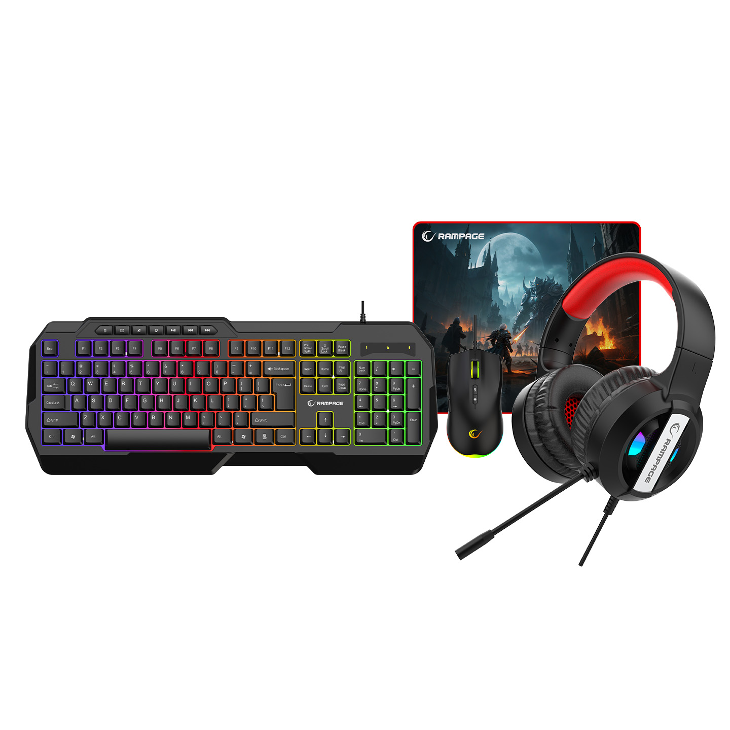 Rampage NIGHTFURY Gökkuşağı Aydınlatmalı USB Gaming Combo 12800 DPI MOUSE 4 in 1 Set Oyun Klavye+Mouse+Pad+Kulaklık