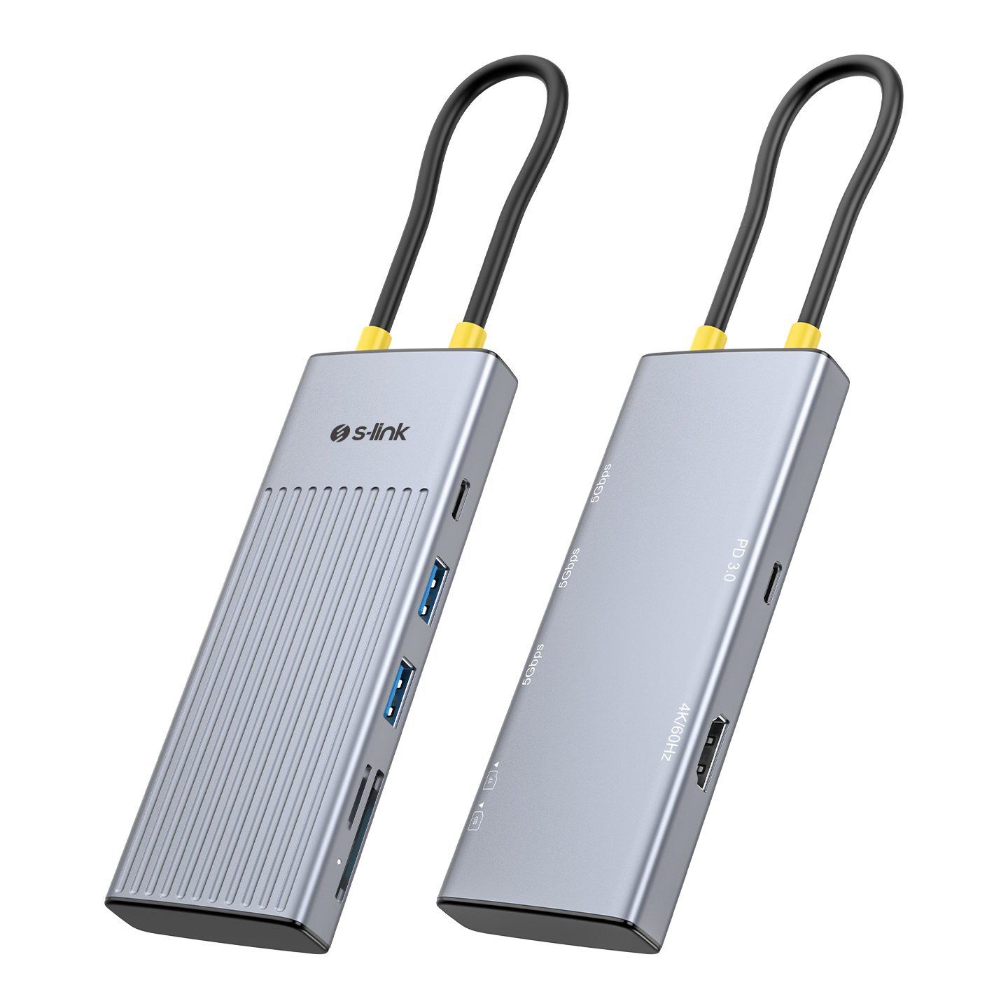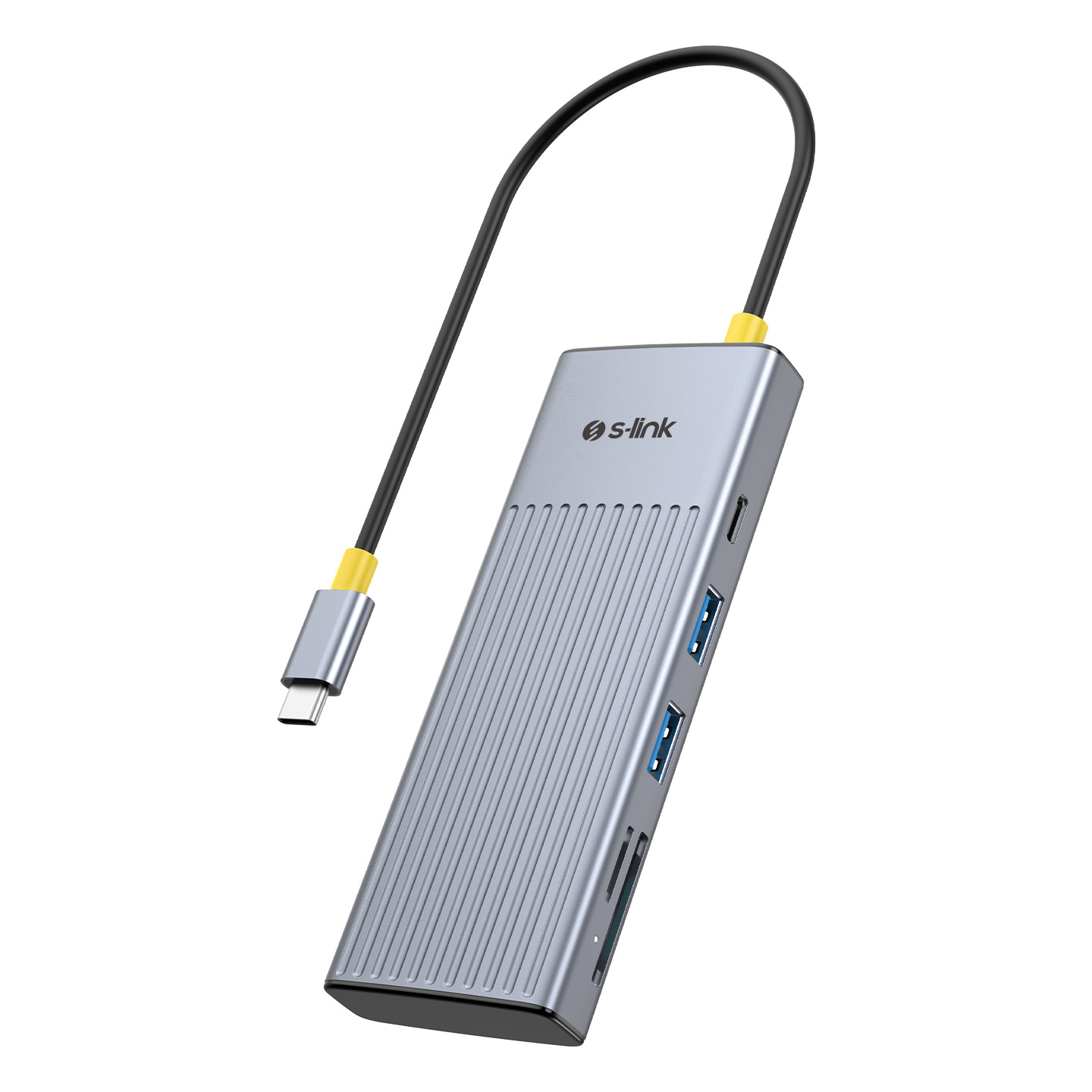 S-link SW-U708 7 in 1 Gri Metal 4K 60Hz HDMI 100W PD, 2xUSB 3.2 1xType-C Data, SD/TF Type C Hub Adaptör
